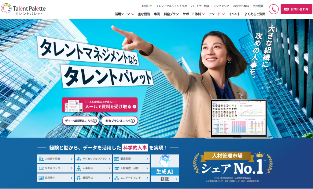さらに、人材データベースの構築、目標管理、多面評価、分析、最適配置支援などにも対応しており、蓄積した人事データを戦略的人材マネジメントに活かせます。人事業務の効率化と、配置・育成・評価の高度化を両立しやすいサービスです。