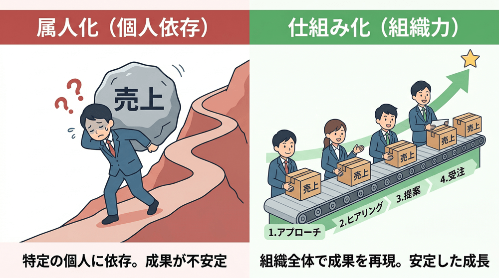 営業は、現場では個人で顧客と向き合う仕事に見えがちです。しかし、企業として安定した成果を出すには、個人が売れるだけでは不十分です。