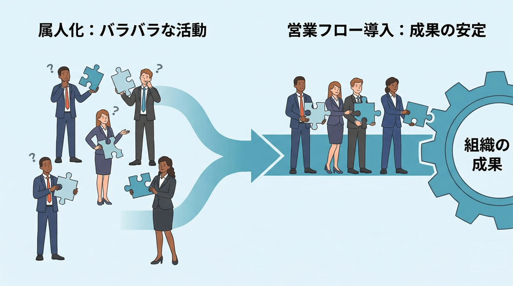営業は相手に合わせた柔軟さが求められる仕事ですが、土台になる流れまで人によってばらばらでは、組織として知見が蓄積しにくくなります。