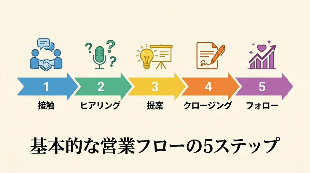 そのためには、見込み顧客への接触、ヒアリング、提案、条件調整、受注後フォローまでの基本ステップを整理したうえで、現場に合う流れへ設計することが重要です。