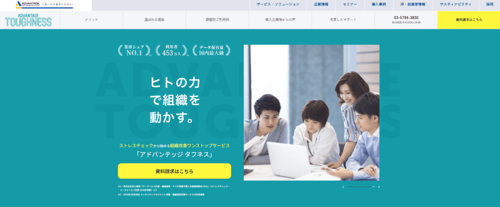 組織診断サービスであり、ストレスチェック機能も含まれています。従業員満足度の向上と社員の離職率低下を目的としており、エンゲージメントサーベイ、ストレスチェック、従業員満足度調査(ES調査・アンケート)による組織診断をワンパッケージで提供します。