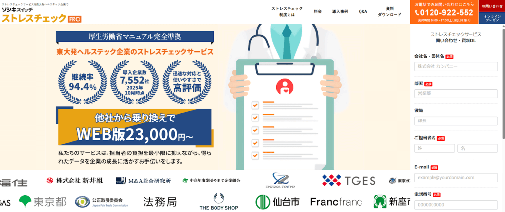 株式会社情報基盤開発が提供する「ソシキスイッチ ストレスチェック」(旧称AltPaperストレスチェック)は、2025年10月時点で7,552社の導入実績があります。従業員のストレス状況を把握し、職場環境の改善に役立てることを目的としています。