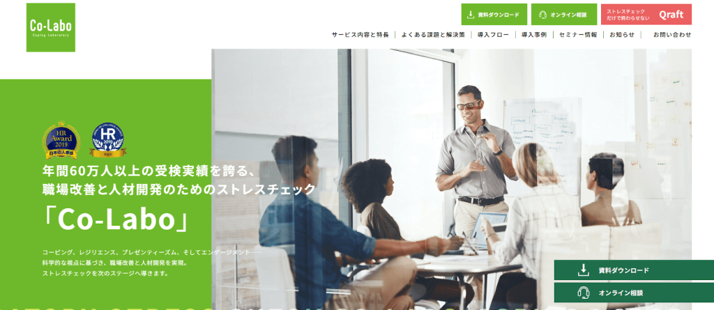 株式会社ヒューマネージが提供する「Co-Labo」は、年間60万人以上の受検実績を持つ、職場改善と人材開発を目的としたストレスチェックツールです。従業員数50名の事業場から数万名規模の大手企業まで幅広く利用されています。