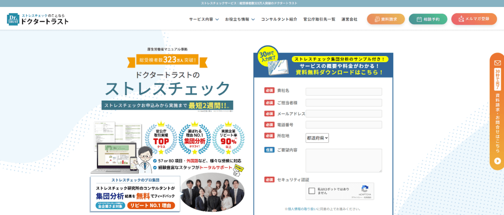 株式会社ドクタートラストが提供する「ドクタートラスト」は、従業員50人以上の企業を対象としたストレスチェックサービスです。総受検者数323万人と豊富な実績があり、特に官公庁での導入が多いです。