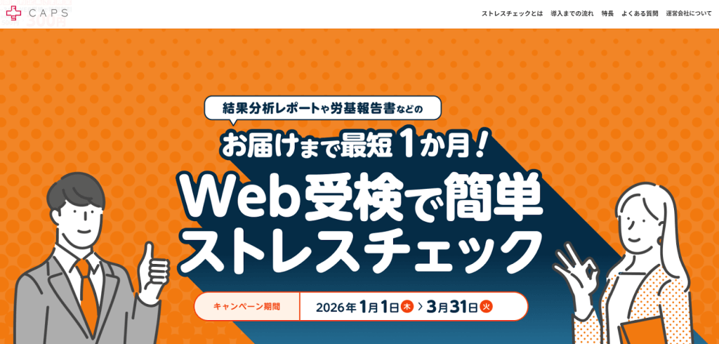 CAPS株式会社が提供する「CAPS」は、医療法人との連携により信頼性の高いストレスチェックサービスを提供しています。Webベースと紙ベースの両方の受検に対応しており、メールアドレスがないパート・アルバイトへの実施も可能です。基本料金内で、準備から個人結果・高ストレス者の抽出までを専属担当者が行っているので、企業担当者の負担を大幅に軽減できます。