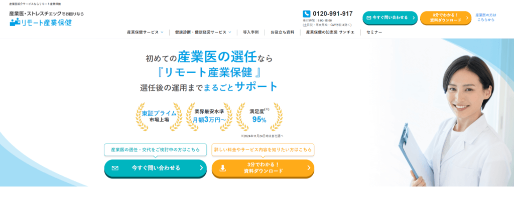 株式会社エス・エム・エスが提供する「リモート産業保健」は、企業向けにストレスチェックサービスを提供する企業です。産業医と産業看護職の2名体制で、ICTを活用した訪問・リモートのサポートプログラムを提供しています。法定義務の対応だけではなく、ストレス予防から復職者のアフターフォローまで支援を受けられるのがメリットです。