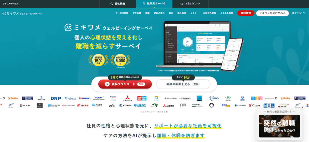 株式会社リーディングマークが提供する「ミキワメ ウェルビーイングサーベイ」は、従業員の心理状態を可視化し、離職を減らすためのサーベイです。ストレスチェックをはじめ、離職・休職予兆のある従業員を見極めたり性格を踏まえた対話方法を共有し、チームのエンゲージメントを高めたりすることが可能です。