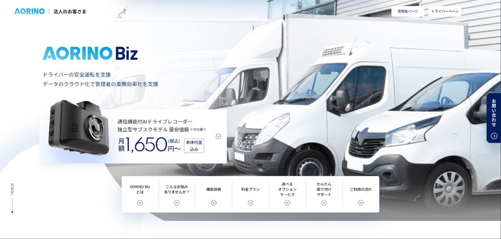 | 主な機能 | ・危険運転を検知・映像で保存 ・日報・月報を自動で作成 ・ライブマップ機能 ・危険運転数を管理者とドライバーにメール送信 |