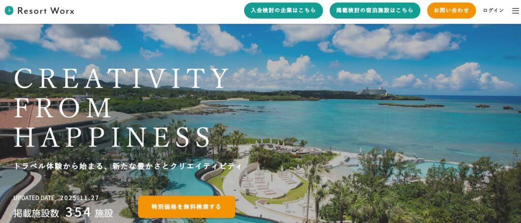 「Resort Worx」は、株式会社リゾートワークスが提供する、全国のリゾートホテルや会員制施設、一流ホテルを30〜80%の特別割引で利用できる福利厚生サービスです。空室活用の仕組みや独自の交渉によって大幅割引を実現しており、企業はコストを抑えながら従業員の旅行・出張・ワーケーション環境を整備できます。