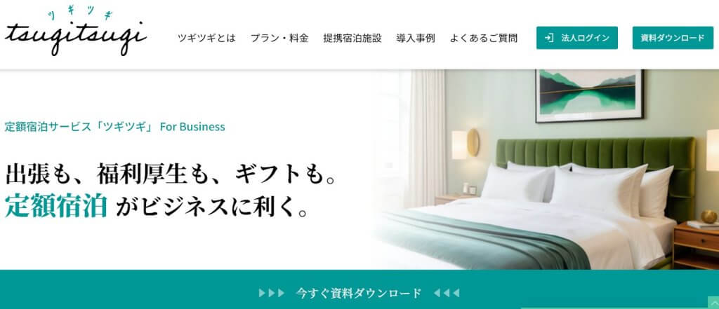 TsugiTsugi(ツギツギ)は、東急株式会社が提供する全国300以上のホテルや旅館を定額で利用できる法人向け宿泊サービスです。出張やワーケーションとしても活用でき、従業員の多様な働き方を支援します。
